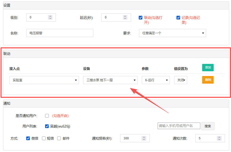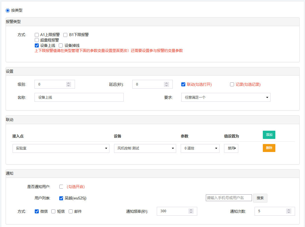 可在后臺對設(shè)備的狀態(tài)、設(shè)備參數(shù)設(shè)置報(bào)警,如掉線報(bào)警、上下限報(bào)警等。報(bào)警設(shè)置中可以設(shè)置需要通知的管理人員,包括通知幾次,通知方式(微信、短信等)。