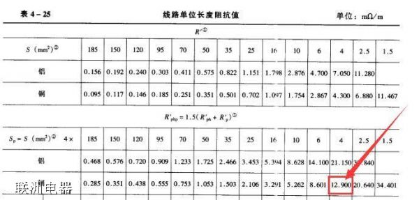 根據C型斷路器的脫扣特性曲線,線路的短路電流需要超過10倍斷路器的整定電流:20AX10=200A。再根據《低壓配電設計規范》GB50054-2011第6.2.4條規定:當短路保護電器為斷路器時,被保護線路末端的短路電流不應小于斷路器瞬時或短延時過電流脫扣器整定電流的1.3倍。那么線路短路電流應不小于200Ax1.3=260A。根據歐姆定律R=U/I可知,該線路的阻抗值不應大于220V/260A=0.846歐。根據工業與民用配電設計手冊第三版的表4-25,可以看到4平方的銅電線的單位長度阻抗值為12.9毫歐/米。