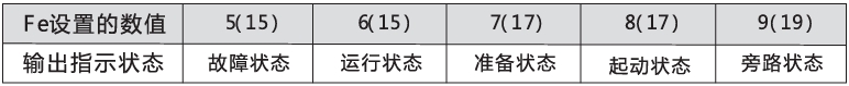 此工作方式包含一個999秒定時器,自設置項F4設定。若F4不為0,則按設置項FE設定的起始時刻開始計時,計時到則輸出改變狀態,若設置項F4為0則立即改變輸出狀態。該輸出的復位時刻是在按F4設置時間延時結束且在準備狀態下再維持1秒時,可編程時序輸出方式是以一次起動過程為控制周期的,如果再次起動電機則自動中斷上次編程輸出過程并重新啟動該過程。設置項FE為5~9(15-19)時,可編程輸出工作于狀態輸出方式,設定的工作狀態輸出如下表: