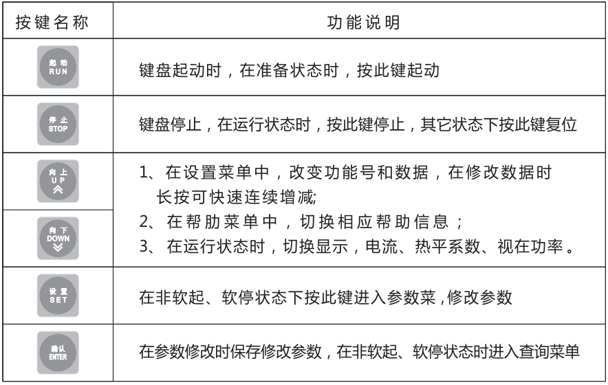 軟起動器共有5種工作狀態:準備、運行、故障、起動和停止。準備、運行、故障;起動時,顯示運行狀態, XXXA ;軟停時顯示軟停狀態, XXXA其中XXXX表示電機電流。