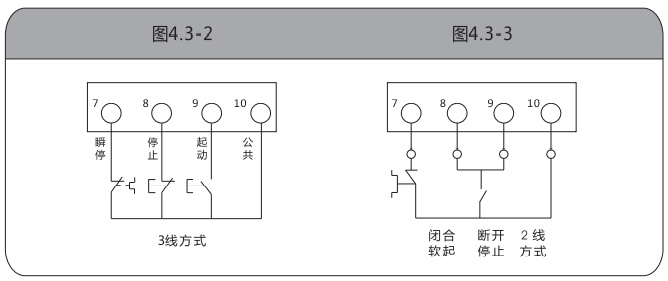 ●當8、9端子并聯作為- -個端子使用時,與10接通為起動,斷開為停止,可用于一個中間繼電器(kA)接點控制起停,此為二線控制。參見圖4.3-3