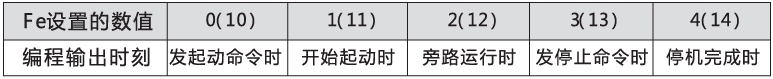 可編程繼電輸出功能有兩種工作方式,既可編程時序輸出方式和可編程狀態輸出方式。設置項FE為0~4(10~14)時,可編程輸出工作于時序輸出方式,設定輸出的起始時刻如下表: