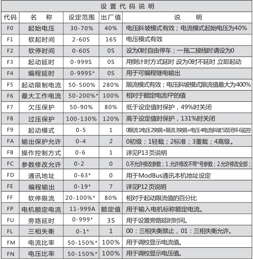 設置項FB用于選擇電機起動控制方式,如下表: