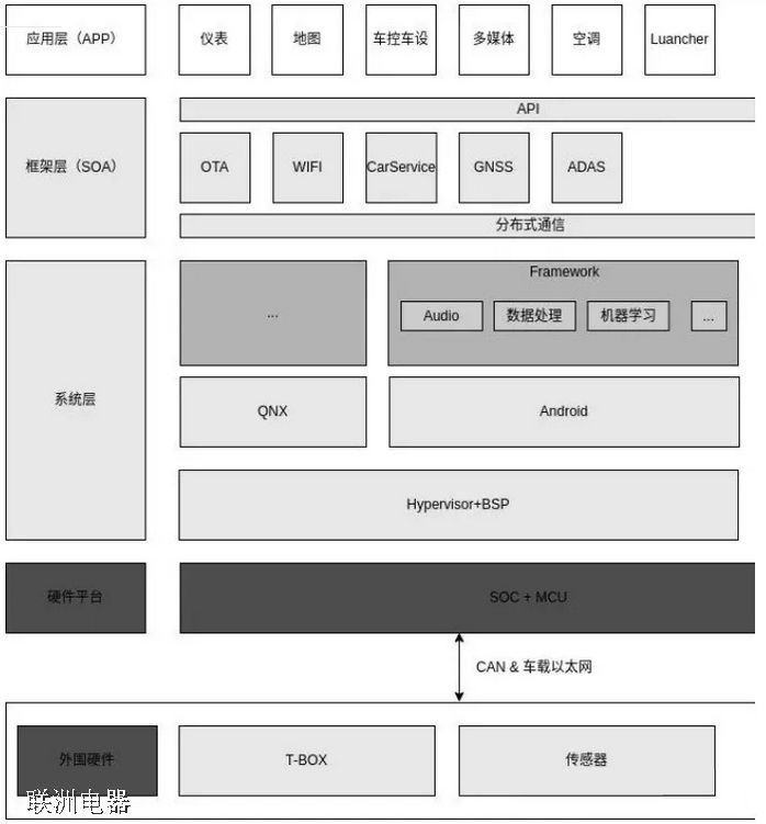 注意:并不是所有的車載操作系統(tǒng)都采用了下面的架構(gòu),比如,特斯拉采用的是基于Linux一套架構(gòu)。