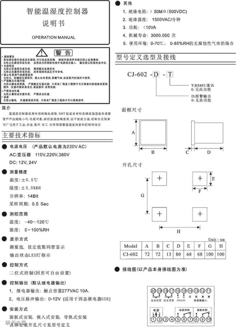 環(huán)境條件:溫度10~40攝氏度,濕度80%;溫濕度監(jiān)控儀表滿足:1)當(dāng)空氣濕度高于40%+5%時輸出報警(無源觸點開關(guān)信號);2)空氣溫度和濕度雙重監(jiān)控,溫度的監(jiān)控采用隨動式溫差控制方式,不采用設(shè)定值固定控制,即測量室內(nèi)溫度-室外溫度小于1攝氏度以上時輸出報警無源開關(guān)接點信號,可以啟動加熱器,直至室內(nèi)溫度-室外溫度高于5攝氏度時停止輸出報警無源接點信號,停止加熱;3)室內(nèi)相對濕度高于40%+5%時輸出報警無源接點信號,可以啟動加熱器,直至室內(nèi)空氣相對濕度低于30%時斷開該接點信號,可自動斷開電加熱器;4)測到的溫濕度參數(shù)可通過MODBUS RS485通訊口遠(yuǎn)傳;5)測量精度不低于0.5級;6)儀表應(yīng)防潮,絕緣性能好;7)具有一D的抗震能力和風(fēng)壓能力;8)弱電回路絕緣電阻常溫時大于100M歐姆,180攝氏度時,絕緣電阻大于50M歐姆。