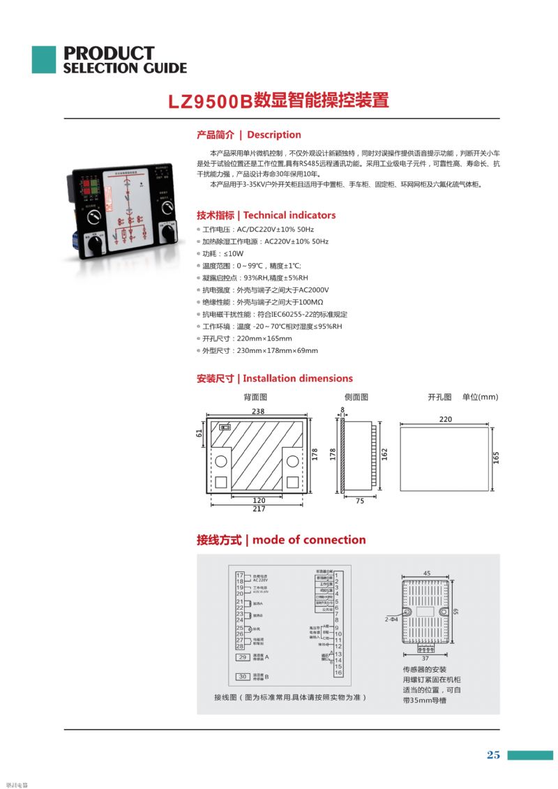 開關柜智能操控裝置是根據當前中壓系統開關柜技術發展而設計開發的一種新型的模塊化、智能型的操作測量顯示裝置。產品集主回路模擬指示、帶電指示及閉鎖、驗電功能、溫濕度數字實時顯示、自動加熱除濕控制、自動排風降溫控制、斷路器分合閘狀態指示、儲能、接地開關指示、手車位置指示、智能防誤語音提示、人體感應報警語音警示、回路電流、電壓、頻率、功率、電能、斷路器進線出線母排溫度測量顯示、故障記錄查詢、時鐘指示、手動自動儲能選擇、遠程就地切換、分閘合閘操作以及RS-485通訊接口等功能于一體。產品以一體化布局配套裝備于開關柜,將簡化開關柜的面板結構設計,美化開關柜的面板布局,完善開關狀態的指示功能和安全性能。產品可用于3~40kV戶內的開關柜,適用于中置柜、手車柜、固定柜、環網柜等多種開關柜。產品符合IEC255-22要求。DG-A01開關柜智能操控裝置的生產廠家是湖南聯洲電器
