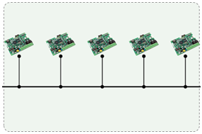 信息在一條公共通道上傳輸,信息接收者從通道上接收所有信息,并根據(jù)規(guī)則過濾發(fā)送給自己的信息。連線少,結(jié)構(gòu)清晰,僅需≤n+1根線。