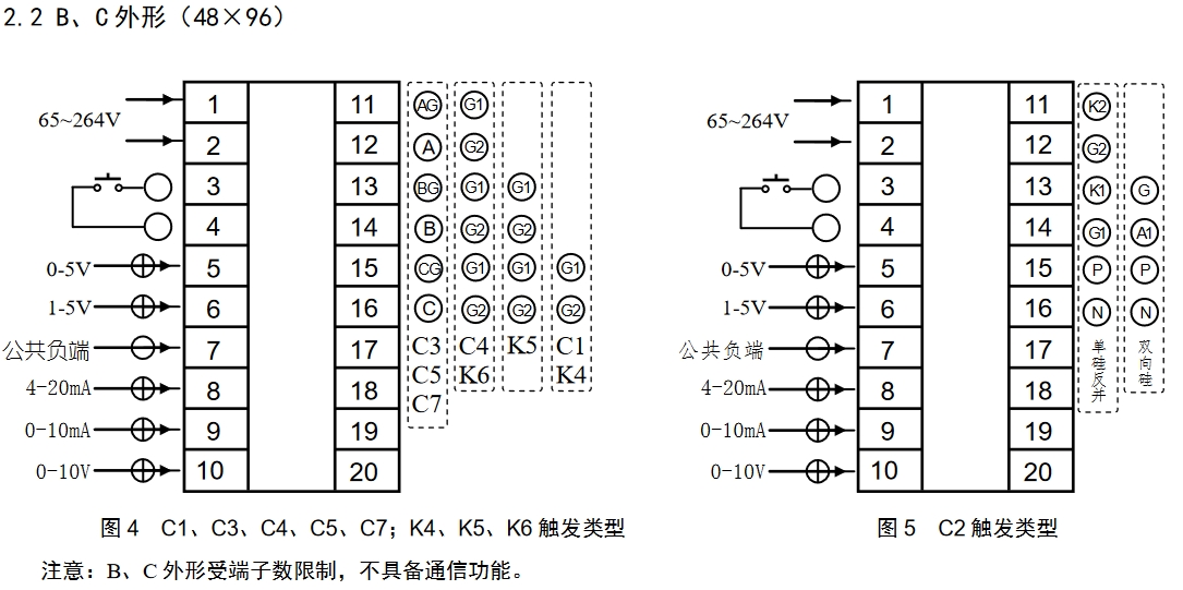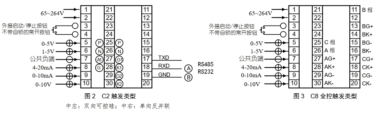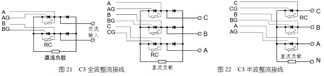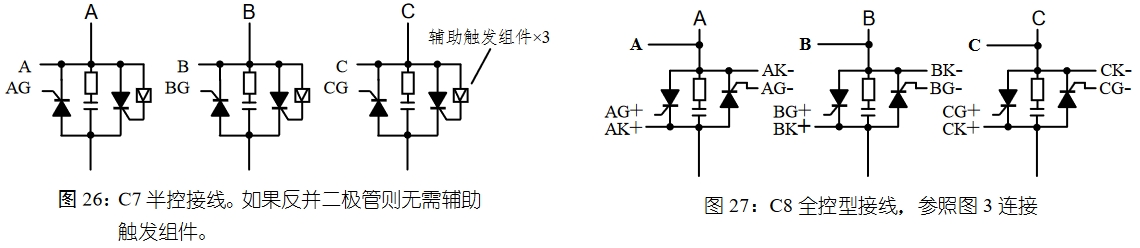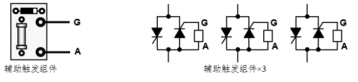 在采用 C3、C7 類型三相三線制移相觸發(fā)時(shí),如果主回路選用兩個(gè)單向反并聯(lián)的可控硅,需要接入隨儀表配送的三個(gè)輔助觸發(fā)組件 AUX;若選用單向硅與二極管反并聯(lián),則不需要接輔助觸發(fā)組件