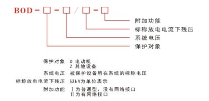 保護對象:A-電機型、B-電站型(并通用于常規配電領域)、C-電容型、O電機中性點特征電壓:有間隙產品為額定電壓,包括3.8、7.6、12.7、42無間隙產品為系統電壓,包括3、3.15*、6、6.3*、10、10.5*、35*(其中帶*的為電機型)