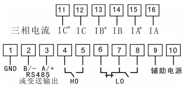 2、一路或二路繼電器報警輸出,實現上下限報警功能或遙控輸出模擬量(DC4~20mA、DC0~20mA、DC0~5V、DC0~10V等)變送輸出模擬量變送輸出與A相的電流值對應;