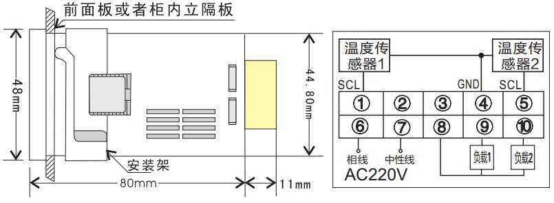 3.1嵌入式外形與安裝開孔尺寸及接線圖(開孔尺寸:45.5*45.5mm)