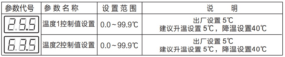 在顯示模式下,持續(xù)按←鍵約5秒,儀表進入控制值設定模式,第一排數(shù)字為溫度1控制值,通過←↓↑按鍵修改起控參數(shù),按←移到第二排,用同樣方式修改溫度2參數(shù),具體見下表。