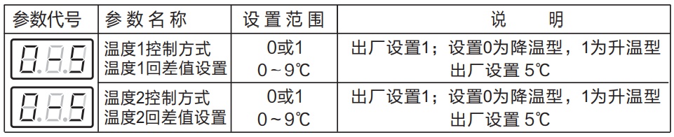 在顯示模式下,持續(xù)按SET鍵約5秒,儀表進入控制方式設定模式,第一排第一個數(shù)字顯示溫度1控制方式,通過↑↓按鍵修改參數(shù),按←移到第一排第三個數(shù)字可修改溫度回差值,修改后通過←移到第二排,用同樣方式修改溫度2參數(shù),具體見下表。
