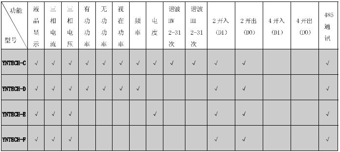 YNTECH-D智能配電儀表系列產品采用先進的微處理器和數字信號處理技術,可測量電網中的單三相電壓、電流、有功功率、無功功率、功率因數、電網頻率、有功電度、無功電度等各種常用電力參數,同時還可選帶開關量輸入、報警輸出、模擬量變送輸出、脈沖輸出、RS485網絡通訊功能。