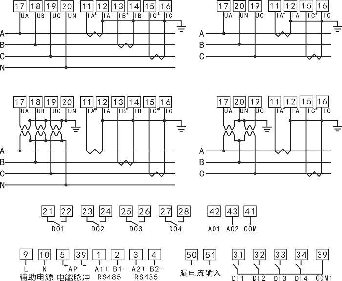 5、41、42、43為模擬量變送輸出,其中41模擬量輸出的公共端;21、22、23、24、25、26、27、28開關量輸出;31、32、33、34、39為開關量輸入,其中39為開關量輸入的共公端。5、39有功電能脈沖輸出。50、51為漏電流輸入。