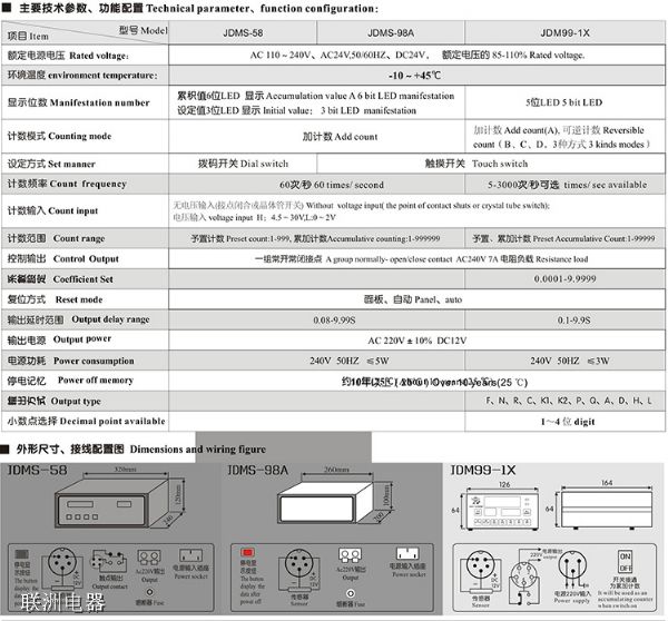 JDMS-58、JDMS-98、JDMS-98A型電子式計數控制器,是由一個三位予置計數器, 一個六位累加計數器,與一個延時繼電器組成的計數控制器總成。計數器采用單片機程序控制, 高亮度led顯示,內裝高容量可充鎳鎘電池,具有無機械磨損、 使用壽命長,可靠性高、顯示清晰、計數響應快等顯著優點. 適用于印刷,食品、化工、包裝、五金、機械等所有自動化生產過程中作為批量予置計數和總量的自動累積計數